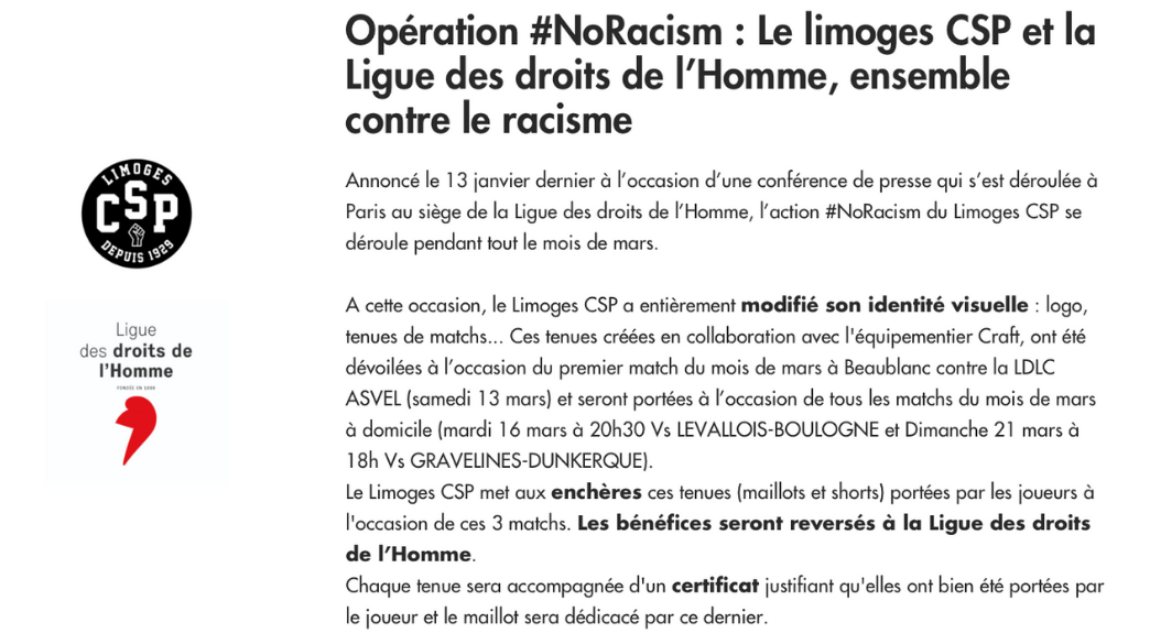 Malik Salemkour, président de la Ligue des droits de l’Homme : “Au terme de la première étape de ce premier partenariat entre le Limoges CSP et la Ligue des droits de l'Homme, la campagne #NoRacism est une belle dynamique en marche. Avec une nouvelle identité graphique sur les maillots du club, une campagne sur les réseaux sociaux, une vente aux enchères au profit de la LDH, un colloque sur le racisme dans le sport mais aussi des interventions en milieu scolaire, les actions se sont multipliées durant le mois de mars afin de sensibiliser le plus grand nombre à notre cause commune.