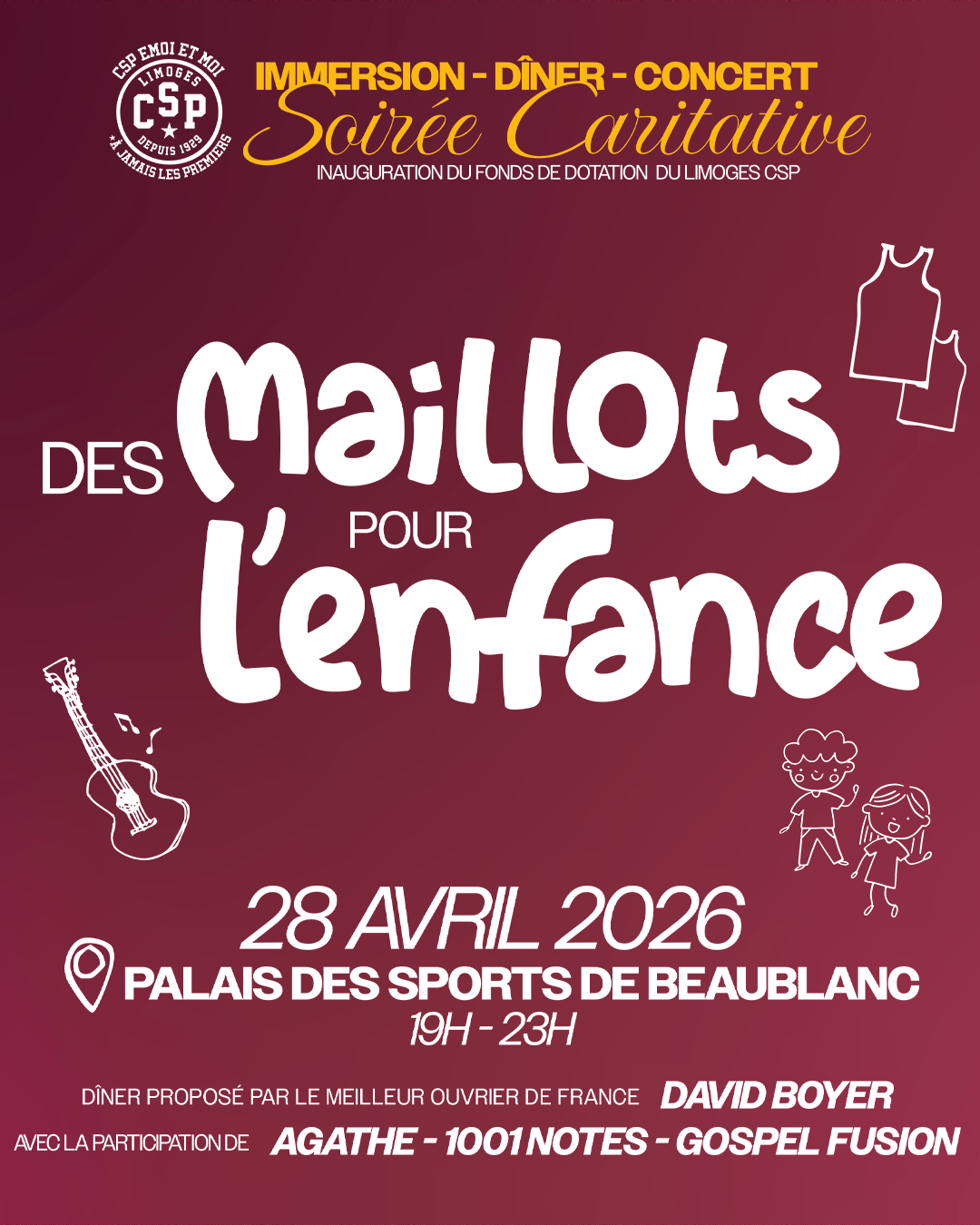 Venez vivre une soirée conviviale, immersive et généreuse alliant l’histoire du Limoges CSP, des moments artistiques, une vente aux enchères et des appels aux dons pour deux projets caritatifs. Plongez dans les valeurs de solidarité du CSP depuis 1929. Réservez votre place et soyez acteur de cette soirée inoubliable !